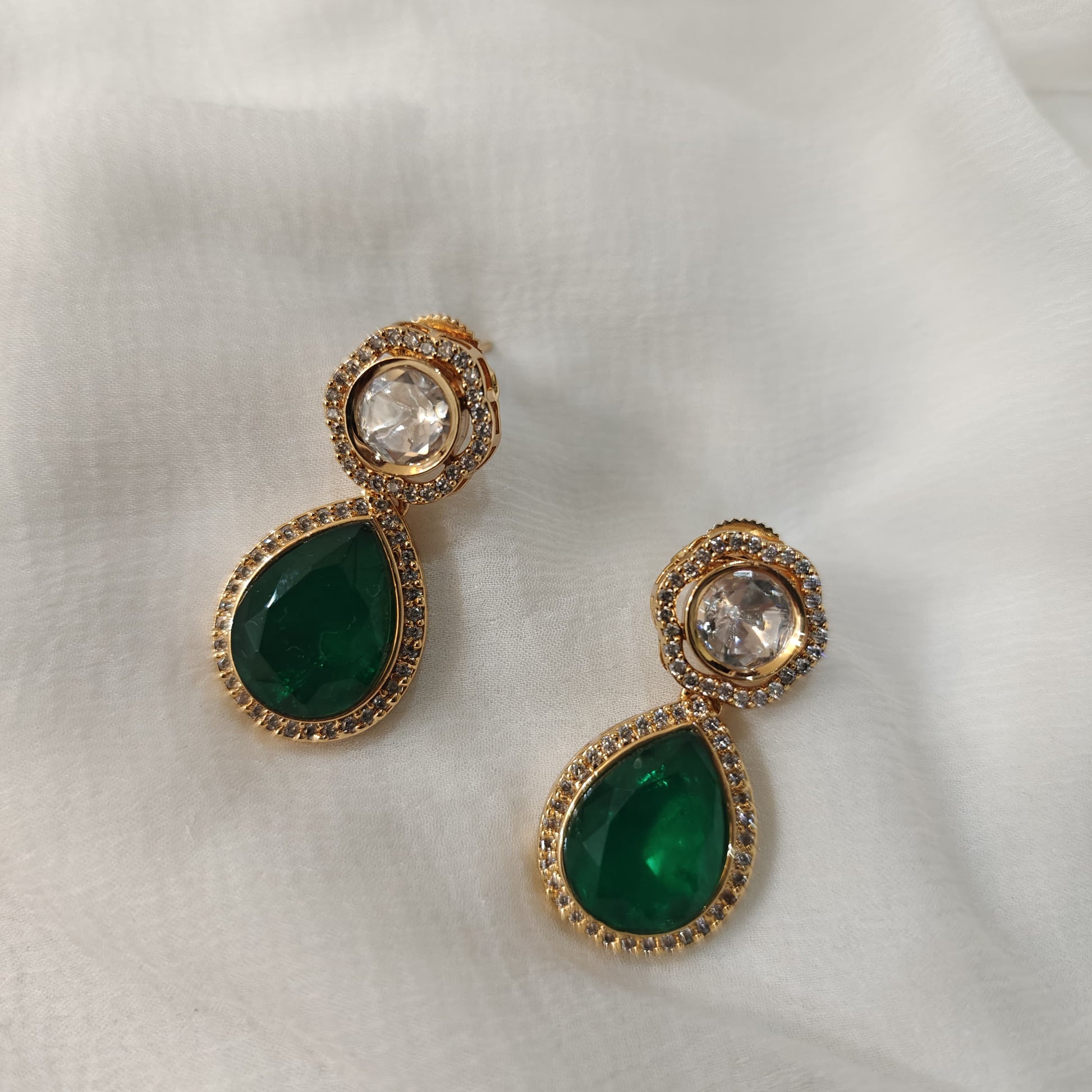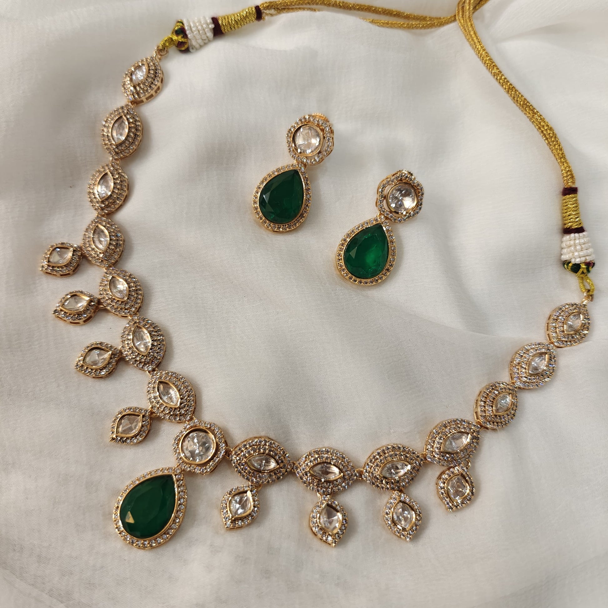 Moissanite Polki With Emerald Drop Neckpiece With Earrings
